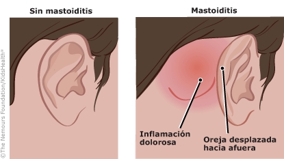 La mastoiditis es un problema poco común que puede ocurrir junto con una infección de oído. Puede hacer que el área detrás de la oreja esté roja, sensible e hinchada. También puede hacer que la oreja sobresalga más de lo normal con respecto a la cabeza. La mastoiditis se trata con antibióticos y, a veces, con cirugía. El tratamiento puede ayudar a prevenir problemas más graves.