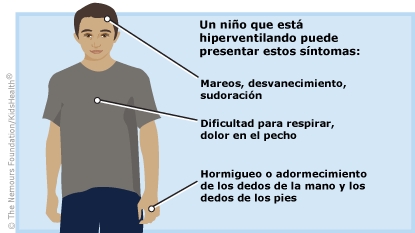 En un episodio de hiperventilación, una persona respira demasiado rápido o demasiado profundamente para lo que el organismo necesita. Esto rompe el equilibrio de oxígeno y dióxido de carbono dentro del organismo. Un niño hiperventilado puede tener dificultad para respirar, sudar mucho, desmayarse, tener dolor en el pecho, temblor en las manos o los pies, estar ansioso o sentir un hormigueo o un cosquilleo en la piel.