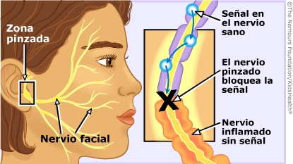 En la parálisis de Bell, el nervio facial se hincha debido a una inflamación o una lesión. El nervio inflamado se comprime en el punto en el que pasa a través del cráneo. Los mensajes no atraviesan el nervio comprimido y, por lo tanto, los músculos se mueven muy poco o no se mueven en absoluto. Un lado del rostro puede caerse y es posible que el párpado no se cierre completamente.