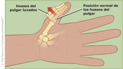 Un dedo pulgar luxado (dislocado) ocurre cuando los huesos del pulgar se salen de su lugar. El tratamiento consiste en colocar una férula en el dedo lesionado. Su hijo tendrá que llevar puesta la férula durante unas semanas mientras sana el pulgar. La mayoría de los niños que tienen una luxación (dislocación) en el pulgar pueden retomar gradualmente sus actividades normales. Después de curarse, el pulgar puede sentirse adolorido o rígido por un tiempo.