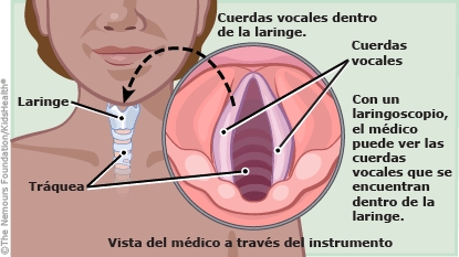 - Laringoscopía flexible: El profesional del cuidado de la salud utiliza un tubo delgado y flexible que se introduce a través de la nariz o la boca. El tubo cuenta con una luz y una cámara en uno de los extremos y esto permite que el profesional del cuidado de la salud vea la garganta a través de un visor del laringoscopio o en un monitor en la sala. En general, esto se hace en un consultorio o una clínica con el niño despierto y se usa un medicamento para adormecer la garganta. A veces, se hace con el niño bajo anestesia general. El procedimiento puede ayudar al profesional del cuidado de la salud a diagnosticar problemas en la garganta y la laringe.