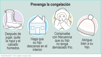 ¿Cómo se puede ayudar a prevenir una nueva congelación? Después de una congelación, la piel está más sensible al frío durante un tiempo. Por eso, será más importante que nunca vestir a los niños con capas de prendas abrigadas, holgadas e impermeables cuando haga frío al aire libre. Asegúrese de hacerlos entrar regularmente para calentarse cuando estén jugando al aire libre en clima frío. Y siempre quíteles el calzado y la ropa húmeda cuando entren.