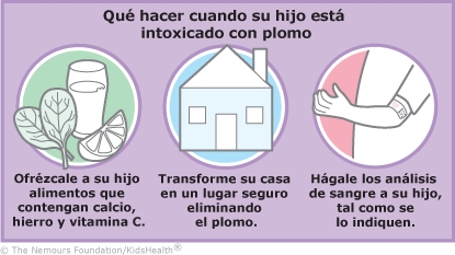 Para ayudar a eliminar el plomo del cuerpo de su hijo, el profesional del cuidado de la salud le recetó un medicamento quelante, que se adhiere al plomo para que el cuerpo pueda eliminarlo a través de la orina. Investigar de dónde proviene el plomo y saber cómo eliminarlo es otra parte importante del tratamiento. Además, una dieta saludable con vitaminas y minerales puede ayudar a su hijo a absorber menos plomo en su cuerpo.