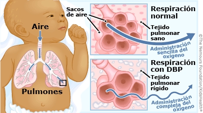 La displasia broncopulmonar (DBP) hace que los bebés tengan pulmones rígidos y dificultad para respirar. Esta afección puede comenzar después de un tratamiento a largo plazo con oxígeno o con un respirador. A medida que los bebés con displasia broncopulmonar crecen, sus pulmones comienzan a funcionar mejor poco a poco. Los padres pueden ayudar a tomar medidas para evitar que sus hijos contraigan infecciones pulmonares y brindarles una buena nutrición para ayudarlos a crecer.