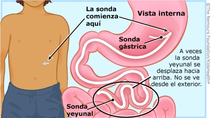 La sonda gastroyeyunal atraviesa la piel del abdomen para llegar al estómago y luego el yeyuno, la segunda porción del intestino delgado. A veces, la sonda se puede desplazar (se sale de su lugar) y termina en el estómago o incluso fuera del cuerpo del niño. En ciertas ocasiones, el desplazamiento ocurre cuando los niños se mueven en la cama, tiran de la sonda o la sonda se enreda con algún otro objeto. El profesional del cuidado de la salud volvió a colocar la sonda gastroyeyunal de su hijo y la revisó. Ya puede usar la sonda como de costumbre.
