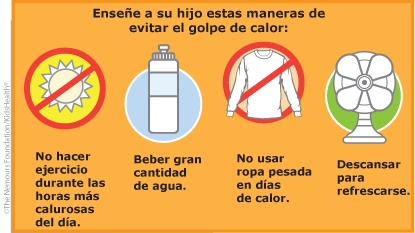 - Asegúrese de que los entrenadores y preparadores físicos de su hijo comprendan los peligros de los trastornos causados por el calor y que tomen precauciones de seguridad cuando el clima esté muy caluroso o húmedo (como acortar o cancelar el entrenamiento, o llevarlo a cabo en interiores).