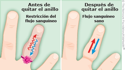 Si un anillo se queda atascado en un dedo de la mano o del pie de un niño, esto puede ser grave ya que impide la circulación de la sangre en el dedo, lo que provoca hinchazón. Al producirse hinchazón, se hace más difícil sacar el anillo y, con el tiempo, puede provocar daños permanentes en el dedo. El médico le quitó el anillo y ahora su hijo puede regresar a su casa.