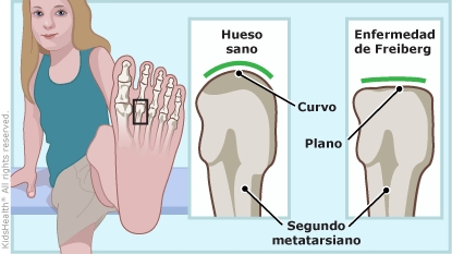 Los niños con enfermedad de Freiberg suelen tener dolor en la base de los dedos del pie. Esto se debe a un cambio en la forma del metatarsiano (un hueso del pie). Es más común en mujeres que practican ballet y gimnasia artística. Cuando se detecta y se trata a tiempo, la mayoría de los niños con enfermedad de Freiberg se curan completamente en unos pocos meses. A veces, si la lesión en el hueso es grave, es necesario operar.