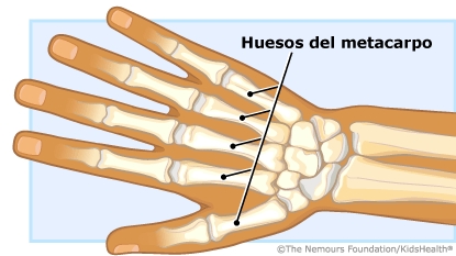 Los huesos metacarpianos son los cinco huesos largos de la mano que conectan los dedos con la muñeca. Su hijo tiene una fractura (quebradura) en uno o más de estos huesos. A su hijo se le colocó una férula (un dispositivo externo con correas o una venda elástica que mantiene una parte del cuerpo inmóvil) para mantener la mano inmóvil. Al colocar la férula, se deja suficiente espacio entre el brazo y la férula por si hay hinchazón. Es posible que la férula se cambie por una escayola en unos días. El especialista en ortopedia (especialista en huesos) verá a su hijo con regularidad y probablemente le hará más radiografías para asegurarse de que el hueso esté sanando bien. La mayoría de las fracturas de manos se curan en aproximadamente 6 a 8 semanas.