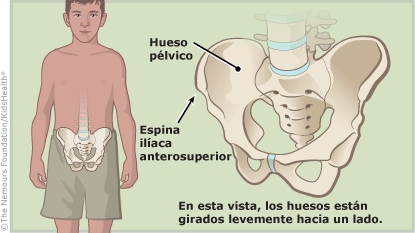 La espina ilíaca anterosuperior es una protuberancia de la parte delantera del hueso pélvico. Puede fracturarse cuando un ligamento (banda de tejido que conecta los músculos al hueso) tira con fuerza del hueso y causa la rotura de una pequeña parte del hueso. Este tipo de fractura recibe el nombre de "fractura por avulsión".