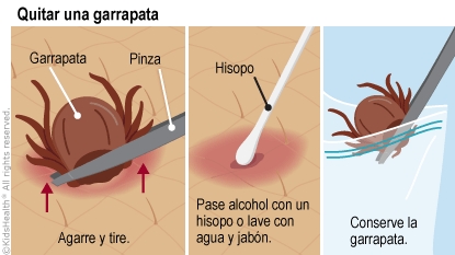 - Compruebe si quedó alguna parte de la garrapata en la piel. Si es así, llame al profesional del cuidado de la salud.