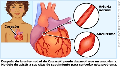 La enfermedad de Kawasaki causa inflamación (hinchazón) en las arterias (vasos sanguíneos). La mayoría de los niños que tienen la enfermedad de Kawasaki y reciben tratamiento se recuperan por completo. Pero algunos pueden desarrollar un aneurisma (abultamiento de la pared de una arteria) u otros problemas cardíacos. El cardiólogo (médico del corazón) de su hijo realizó un ecocardiograma y tal vez otras pruebas para ver si el niño tiene problemas en el corazón. Hablarán con usted sobre los resultados de las pruebas y los pasos a seguir.