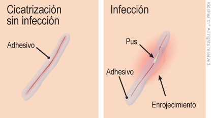 ¿Qué ocurre cuando un corte que se unió con adhesivo para la piel cicatriza? El adhesivo para la piel mantiene unidos los bordes de un corte mientras cicatriza y ayuda a proteger la herida de las infecciones. Es normal que haya un enrojecimiento leve o picazón en la zona del corte. Después de 7 a 10 días, el corte debería haber cicatrizado y el adhesivo se caerá solo.