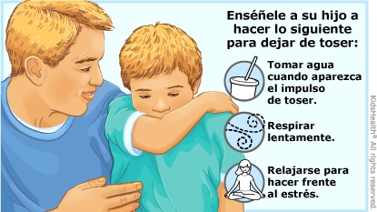 ¿Cómo se trata la tos por hábito? La tos por hábito suele tratarse en casa ayudando a los niños a encontrar formas de detener la tos y controlar el estrés. (el estrés puede agravar la tos). Los médicos no suelen utilizar medicamentos para tratar este tipo de tos porque esta no se debe a un problema médico. A veces, la terapia psicológica o del habla pueden ayudar. Si el médico no está seguro de qué está causando la tos, puede hacer pruebas o enviar al niño a un especialista en pulmones (neumólogo) para obtener más información.