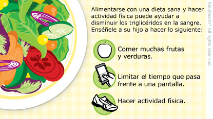 En la mayoría de los niños, alimentarse con una dieta saludable y realizar actividad física ayuda a reducir los triglicéridos. Si su hijo tiene sobrepeso, también será de ayuda que baje de peso. Siempre debe hablar con el profesional del cuidado de la salud antes de poner a su hijo a dieta.