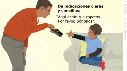 - Dígale: "Vístete, por favor". Cuando su hijo haya hecho lo que le pidió, dígale: "Muy bien, ya estás vestido". Después, dígale: "péinate". Y continúe dándole indicaciones hasta que haya hecho todas las tareas.