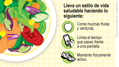 - Come un variedad de alimentos sanos que incluyan proteínas (como el pollo y el pescado), cereales integrales, fruta, verdura y productos lácteos descremados.